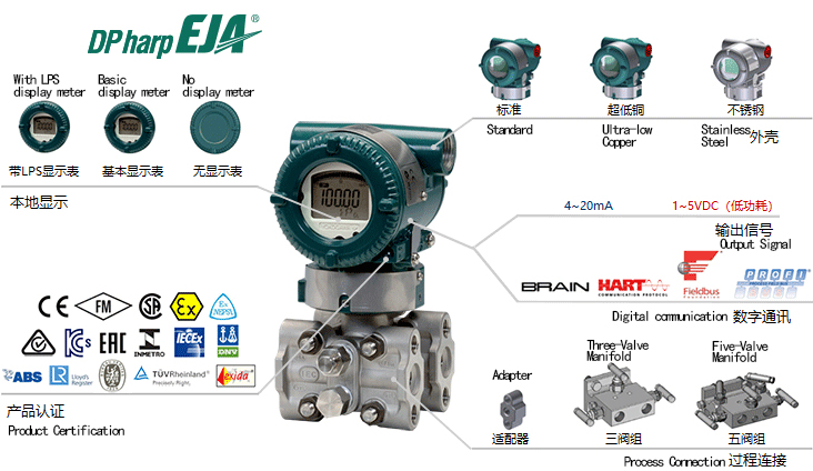 The EJA115E Differential Pressure Transmitter with Built-in Orifice Plate is suitable for micro-flow measurement and outputs a 4–20mA DC signal corresponding to the measured flow rate. It can measure, display, or remotely monitor static pressure, and features functions such as fast response, remote setting, and self-diagnosis.
