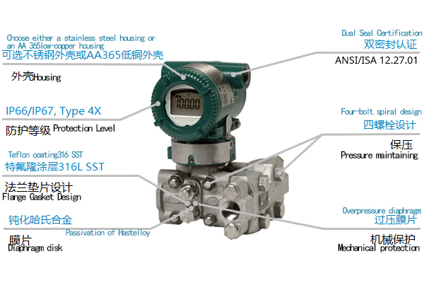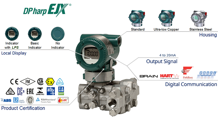 The EJX115A Differential Pressure Transmitter with Built-in Orifice Plate is suitable for micro-flow measurement and outputs a 4–20 mA DC signal corresponding to the measured flow rate. It can measure, display or remotely monitor static pressure, and features functions such as fast response, remote setting, and self-diagnosis.