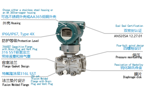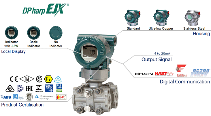 The EJX120A high-performance differential pressure transmitter for micro-pressure adopts monocrystalline silicon resonant sensor technology and is suitable for measuring the flow rate, liquid level, density, and pressure of liquids, gases, or vapors. The EJX120A converts the measured differential pressure into a 4–20 mA DC current signal for output, and features functions such as fast response, remote setting, and self-diagnosis.